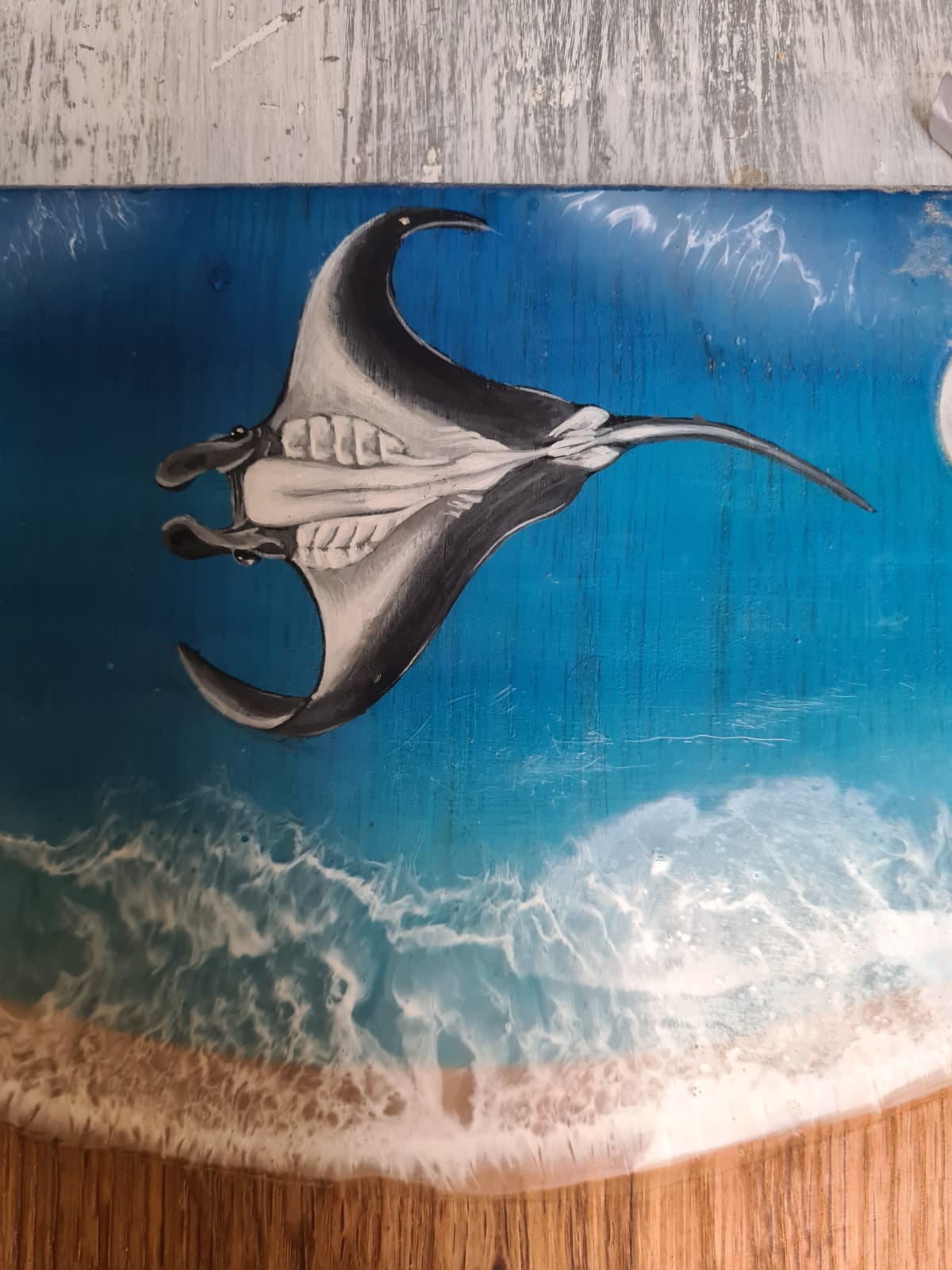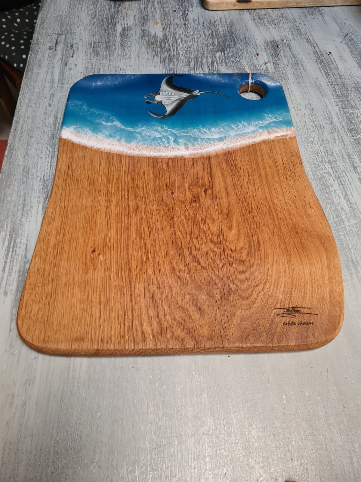 Planche en bois de chêne et époxy et dessin